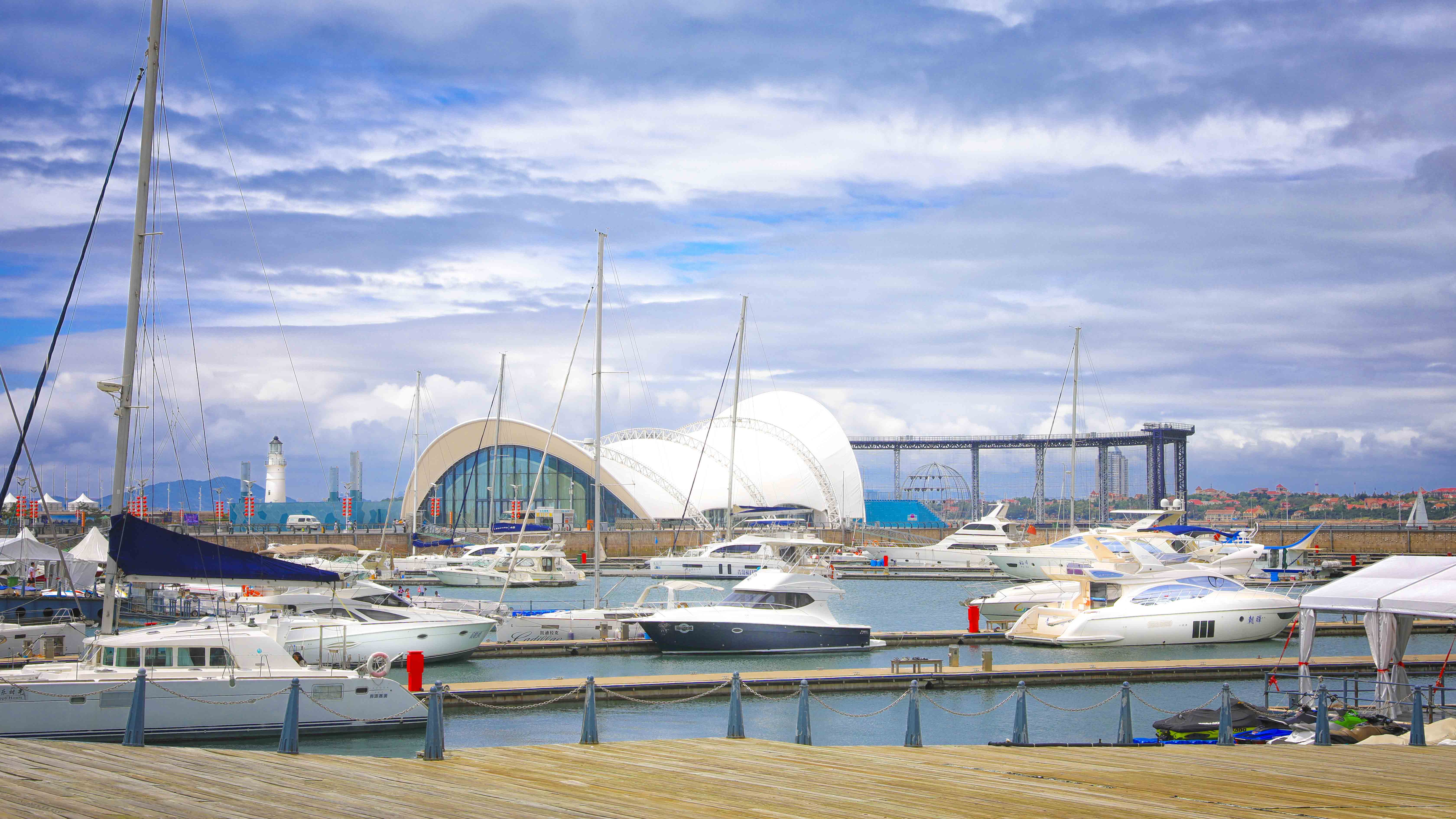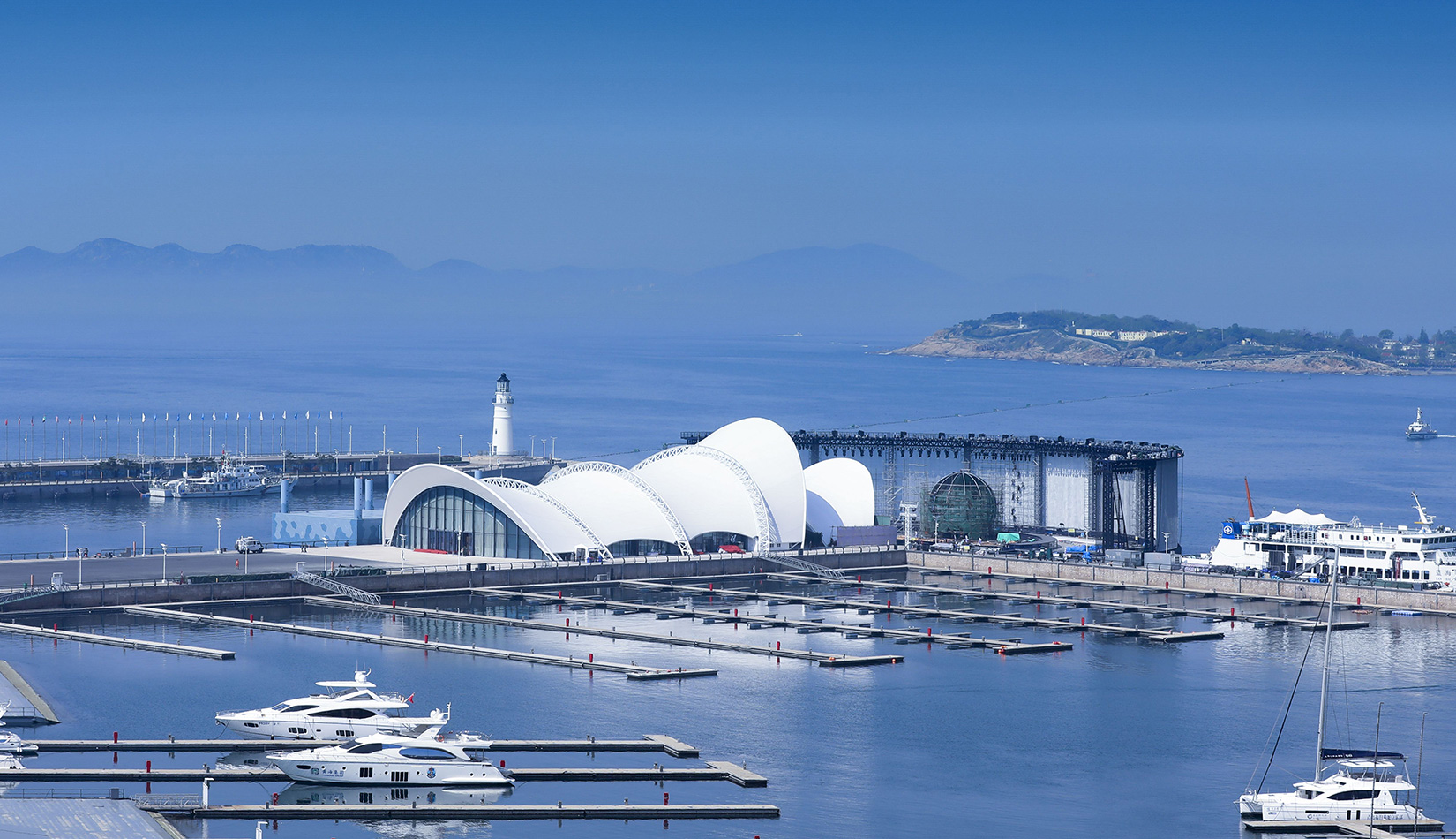 本項目在保留原有建筑主體結(jié)構(gòu)的基礎(chǔ)上,結(jié)合本次會議活動的相關(guān)需求,對其規(guī)模、形象、功能進行改造提升。主題材料采用輕盈的鋼結(jié)構(gòu)與膜結(jié)構(gòu),造型宛如海浪中靈動的風帆,彰顯青島這座海洋名稱、帆船之都的獨特魅力。