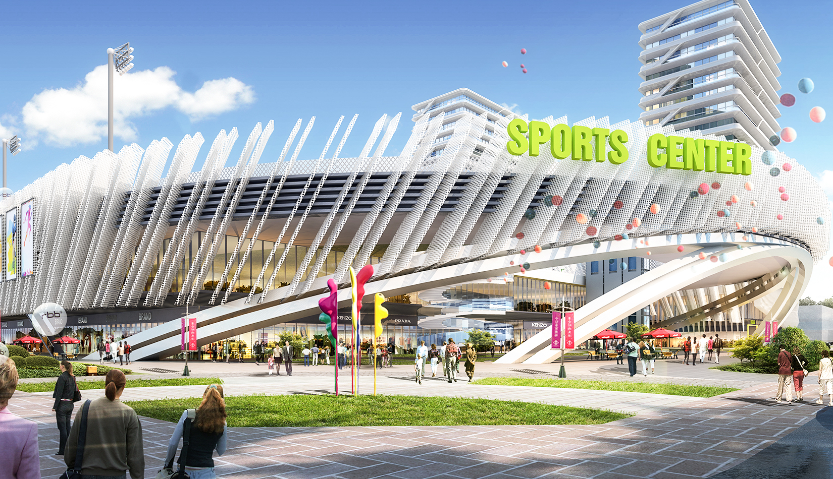 本項(xiàng)目提取高鐵動(dòng)車和海浪浪花的概念,用白色鋁板陣列與變化塑造出體育綜合體泛著浪花的海洋波浪造型。同時(shí)利用動(dòng)車動(dòng)感流線的造型設(shè)計(jì)出公寓的整體方案。海浪與動(dòng)車流線結(jié)合,不僅代表了青島的特色,更是詮釋了積極動(dòng)感的體育精神。將景觀引入建筑,以景觀打造形象,形成未來(lái)綜合體發(fā)展模式。