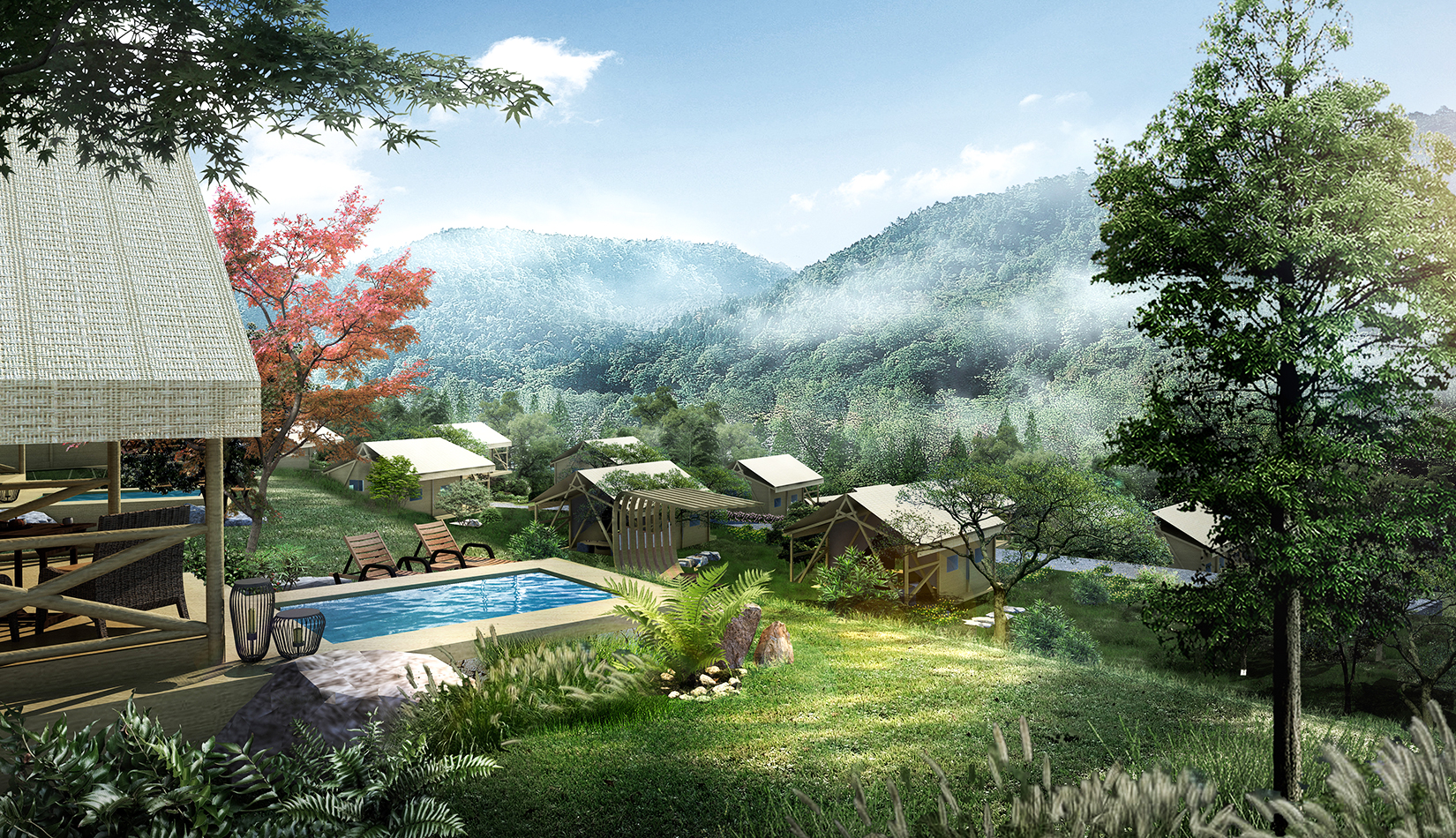 根據(jù)基地的地勢分布及功能需求,空間結(jié)構(gòu)上分為“一帶兩軸三核心五組團”。建筑設(shè)計的五個組團,分別是濱水休閑組團、水畔風(fēng)光帳篷組團、高端養(yǎng)心帳篷組團、中心服務(wù)組團及山居野趣帳篷組團??头坎糠植捎脦づ穸燃傥莸姆绞?,凸顯野奢度假的浪漫形式。