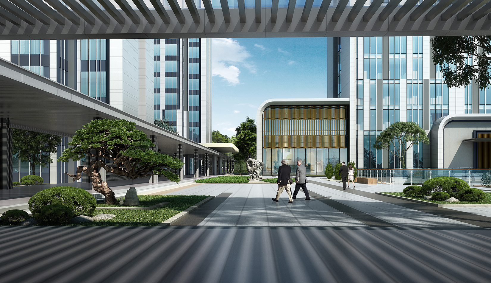 建筑圍合共享的中間庭院,庭院采用新中式風(fēng)格,屋頂設(shè)計屋頂花園,靜謐淡雅,為人們提供一個安靜休憩空間。
