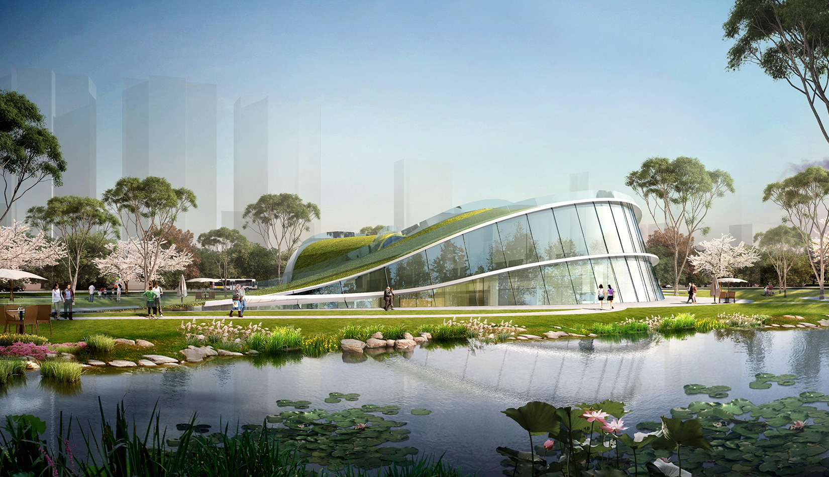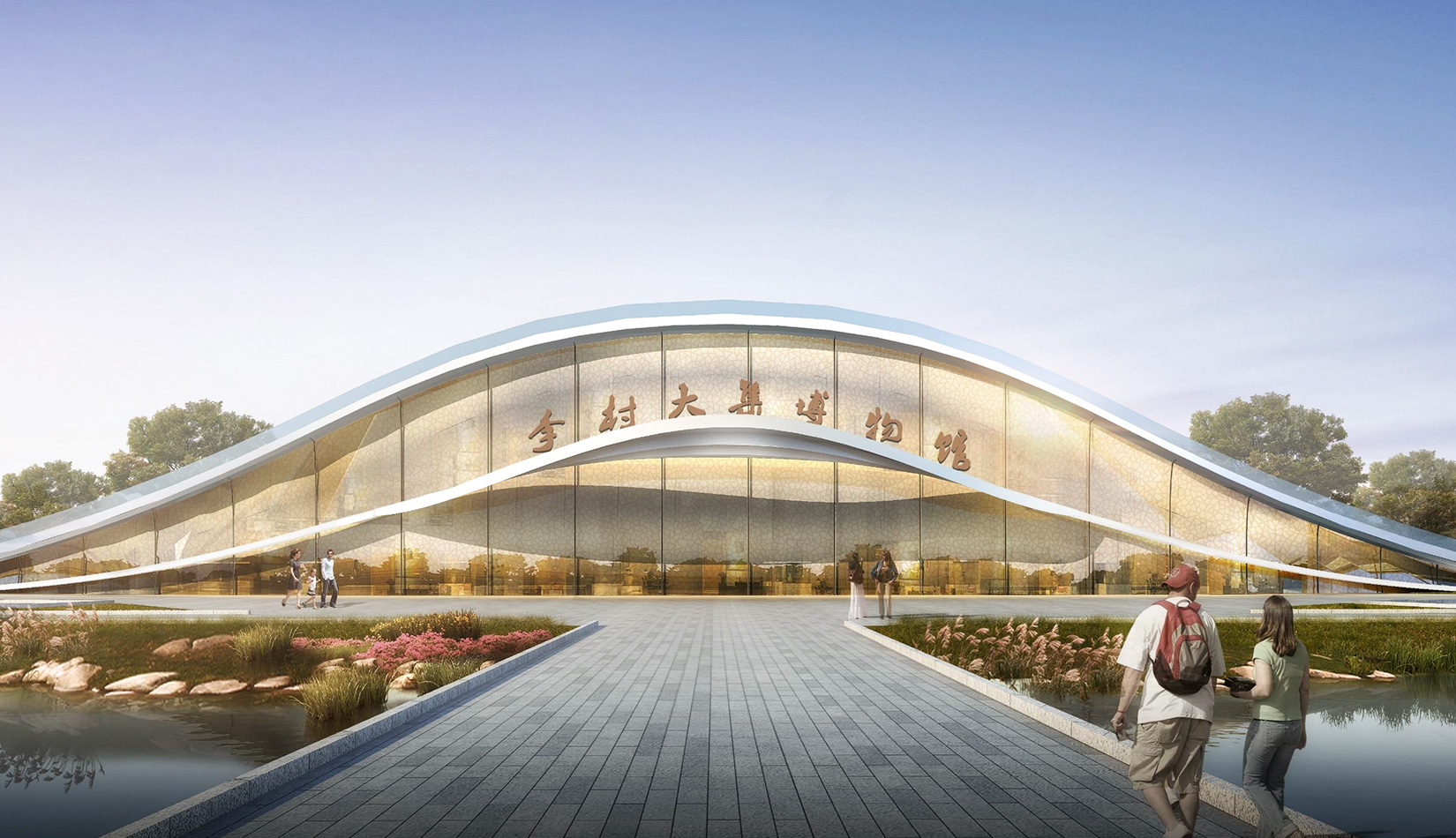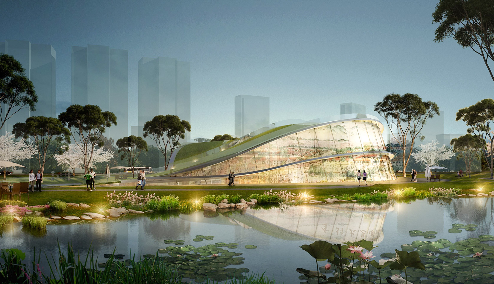 該項目基地位于濱河公園內(nèi),目標(biāo)要將博物館打造成一個生態(tài)建筑,建筑能與環(huán)境有機(jī)融合。在這一理念下,將博物館設(shè)計為樹葉形,建筑猶如一片樹葉飄落在公園內(nèi),以此體現(xiàn)建筑與環(huán)境的融合。將樹葉形建筑設(shè)計為覆土建筑,最大程度還原基地一片綠色,以此呼應(yīng)李村大集的“還原”內(nèi)涵。通過設(shè)計兩個曲線形體相互交融形成建筑的最終體量,以此體現(xiàn)相逢意蘊(yùn),呼應(yīng)李村大集的“相逢”內(nèi)涵。