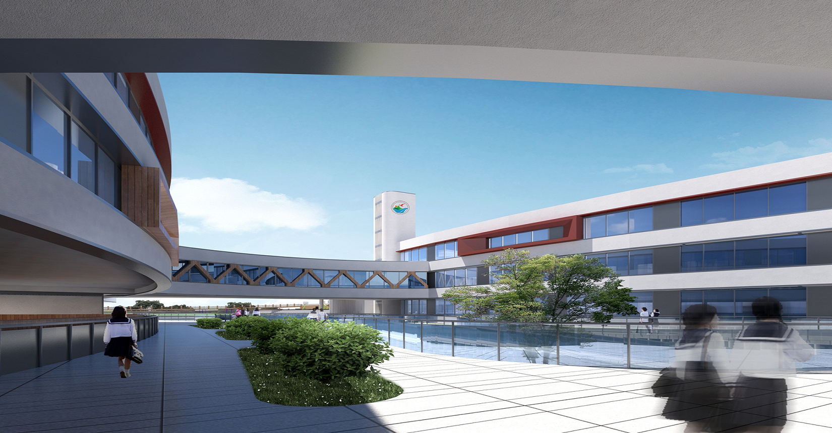 校園規(guī)劃采用曲線手法,營造流水姿態(tài),將東側(cè)山脈與西側(cè)河流連接在一起。設(shè)計(jì)現(xiàn)代化“山水”校園,使學(xué)生在自然中成長。營造活水發(fā)源的“源頭”意境,寓意教育為人類文化長河的源頭,呼應(yīng)學(xué)?!霸搭^”文化。曲線舒展的形體,整體采用白色色調(diào),局部以紅黃色進(jìn)行點(diǎn)綴,風(fēng)格純潔又不失活潑。